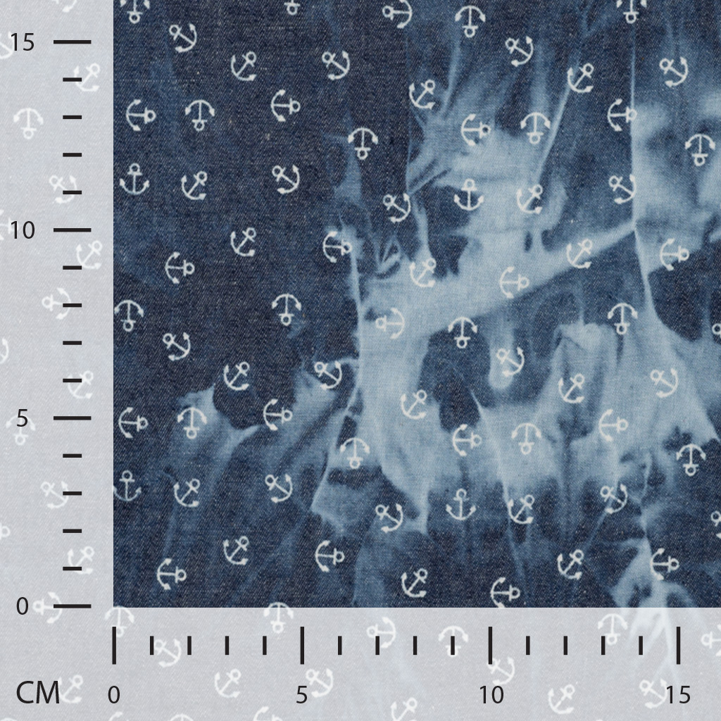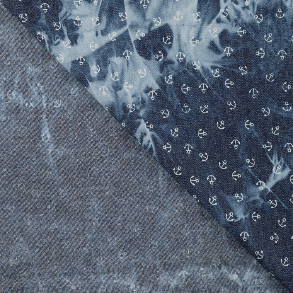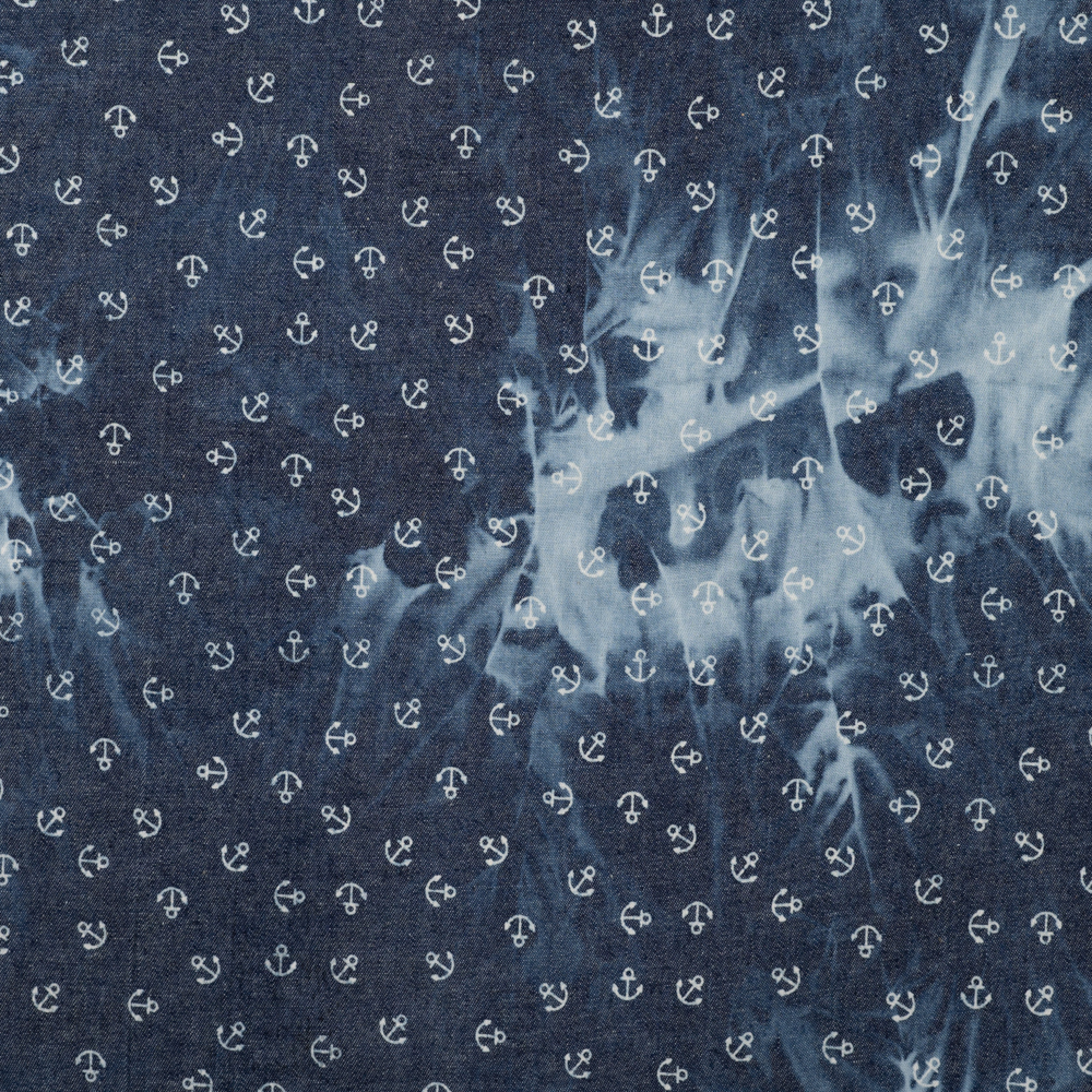 Leichter Jeansstoff Chambray Kleine Anker weiß auf Jeansblau Batiklook