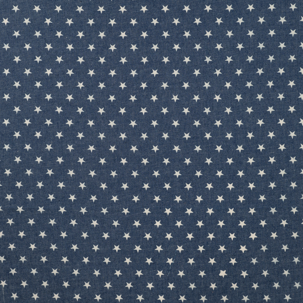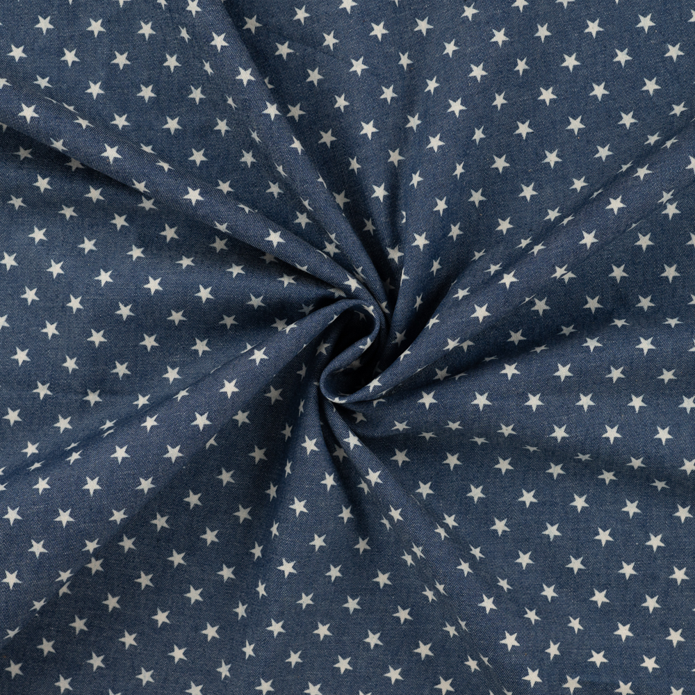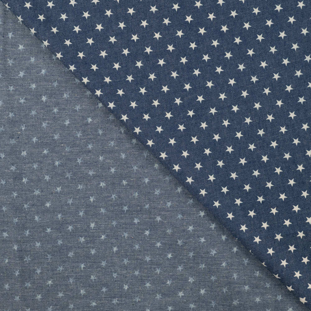 Leichter Jeansstoff, auch Chambray genannt. Der Stoff ist einseitig bedruckt. Der Stoff fühlt sich wie ein normaler Baumwollstoff an, ist sehr schön leicht fallend. Die kleinen Sterne haben einen Durchmesser von ca. 0,6cm.