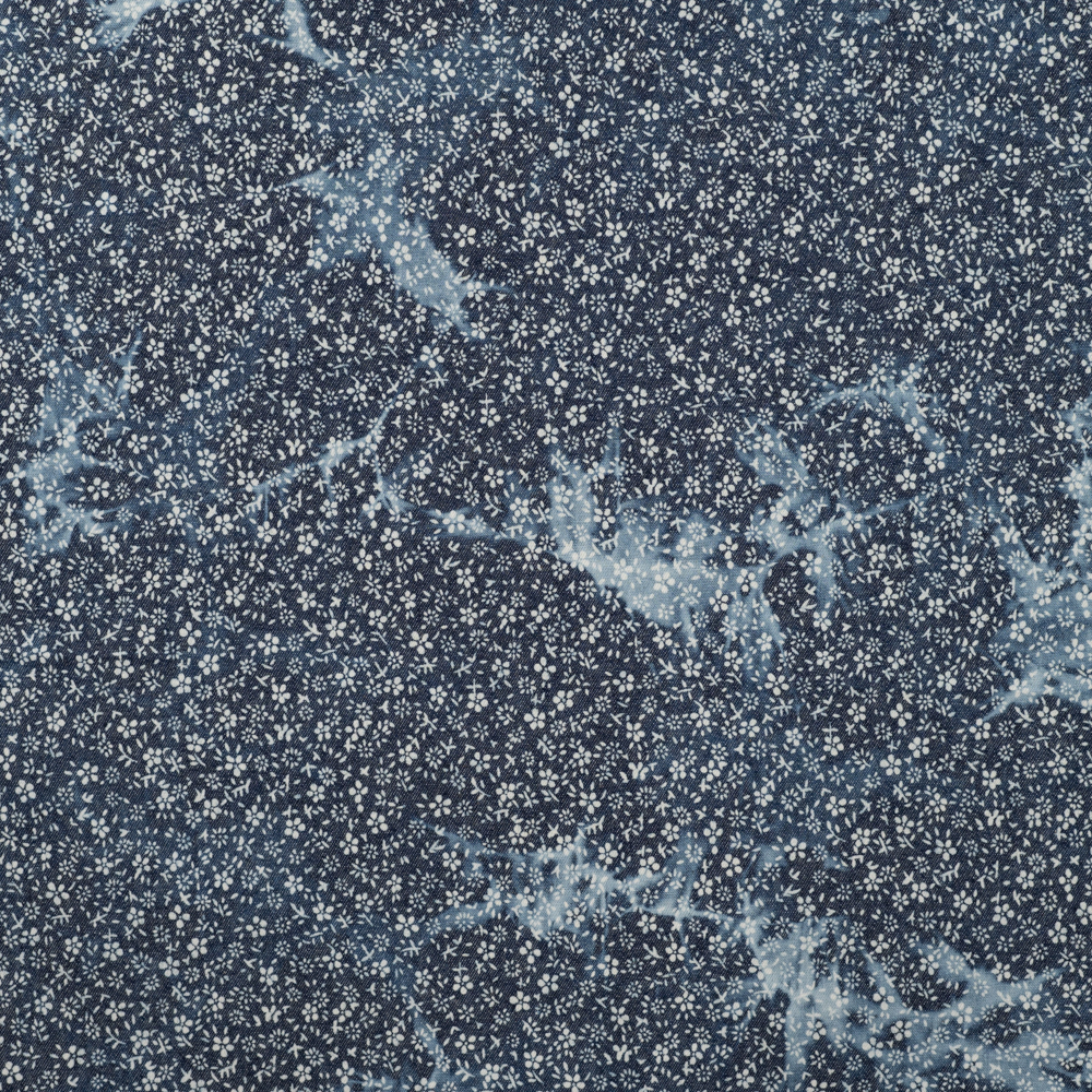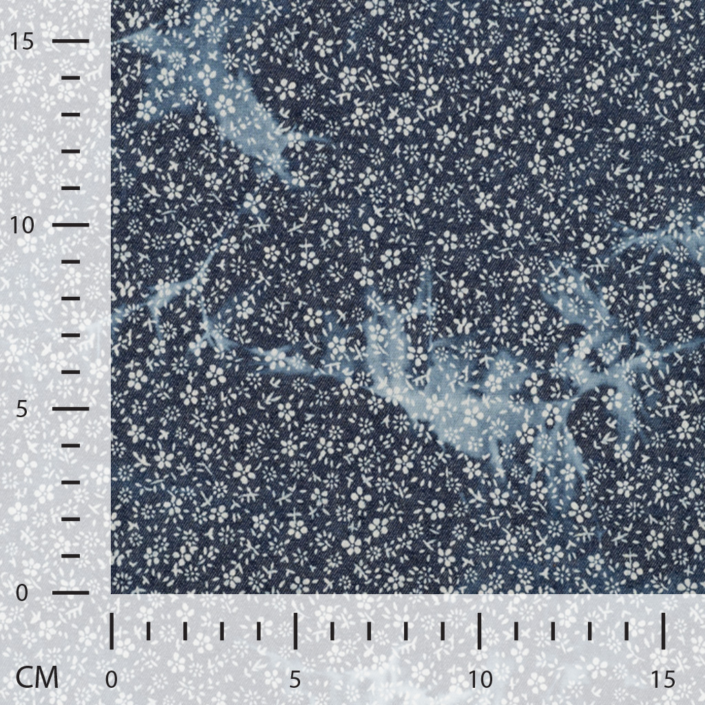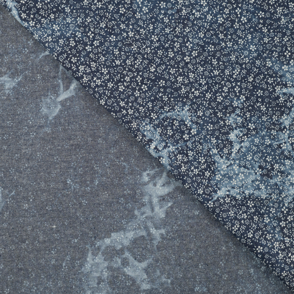 Leichter Jeansstoff, auch Chambray genannt im Batiklook bedruckt mit kleinen Streublümchen. Der Stoff fühlt sich wie ein normaler Baumwollstoff an, ist sehr schön leicht fallend.