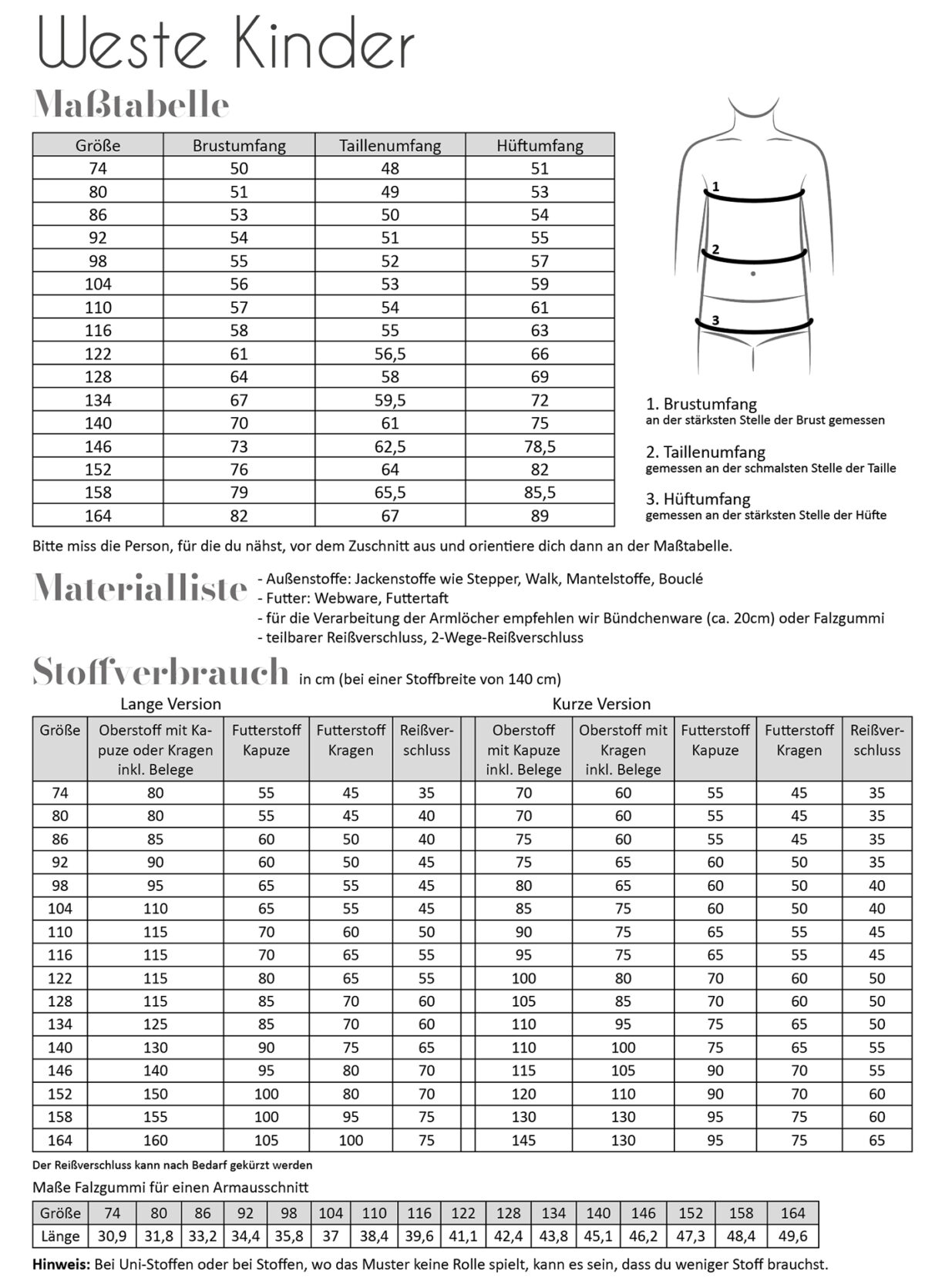 - Für die Verarbeitung der Armlöcher empfehlen wir Bündchenware (ca. 20 cm) oder Falzgummi